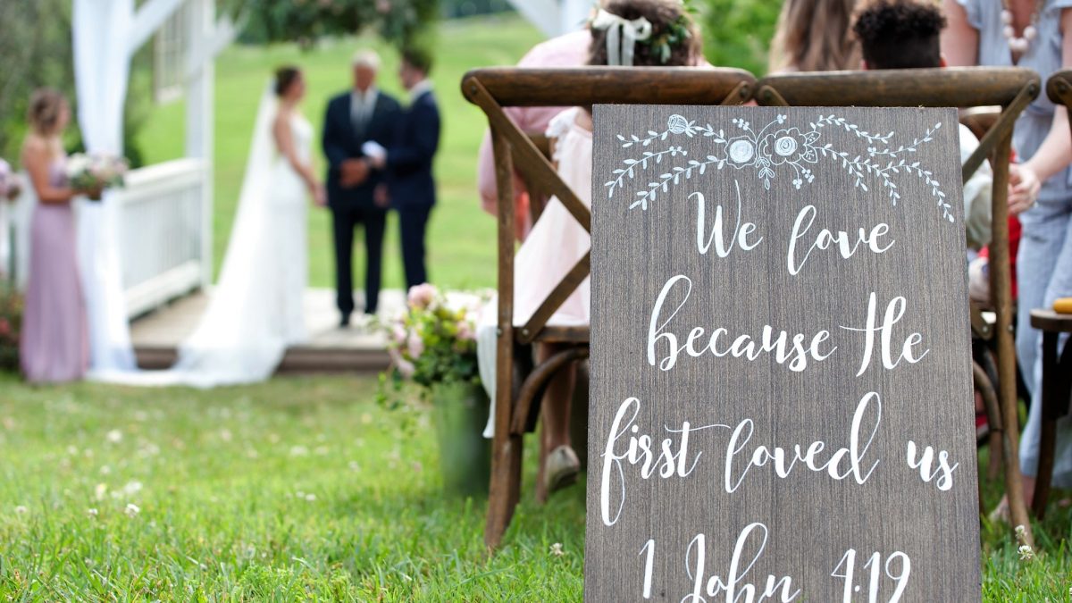 There is also a trend of having signs designed with the couple’s favorite Bible Verse. The most recognized is “I have found the one whom my soul loveth,” taken from Songs of Solomon 3:4. There can be multiple signs with different verses lining the ceremony aisle as guests find their seats. Wooden signs can be placed on each side of the altar or above the altar — depending on location and accessibility. The ring bearer can carry the “rings” on a Bible. The Bible could be a new one to bring into the new marriage or perhaps, a Bible that belonged to a loved one who is no longer living. This would represent “something old.” I saw a lovely way to use a Bible as a guest sign-in book. Each guest would highlight their favorite verse in a keepsake Bible and write their names beside the verse. I love this idea!