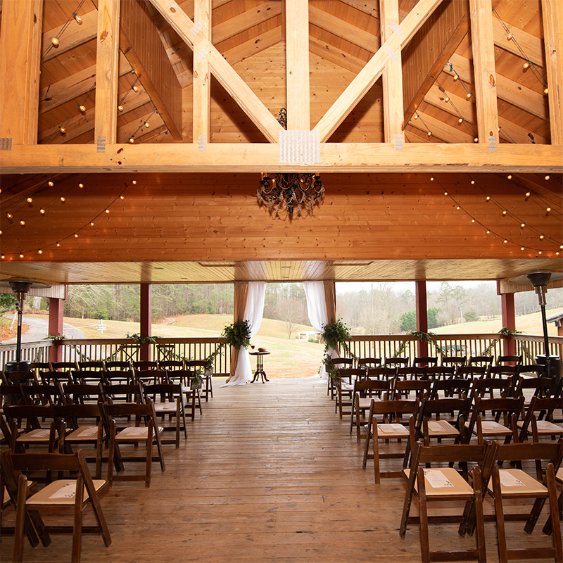 The third location for both the wedding ceremony and reception is the Storehouse building. The significant advantage of this location is that it is covered for our guests’ comfort and provides a backup plan in lousy weather. It features a vaulted ceiling with a stunning wrought iron and crystal pendant chandelier. The open concept of the covered front porch allows guests to enjoy views of the Great Smoky Mountains during each season. Both the interior and exterior use Tuscany-inspired lighting for mood and romance. Every wall, flooring, and railing was built with hardwood.