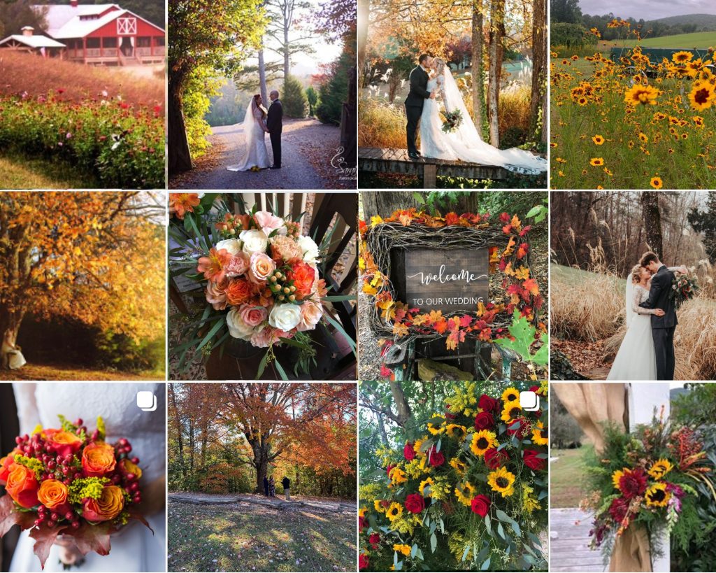 The colors of our fall in the Smoky Mountains need very little in the way of description. There’s a reason that this season of the year is the most highly demanded time for weddings, special events, football, and tourists from all over the United States and various countries. The photos in the collage above illustrate the colors at our venue. The peak time for the best textures and colors of autumn is typically from the end of October through the second or third week of November. But, of course, as with most everything in nature, the timing depends on the weather. Should a potential bride and groom prefer a specific date for their wedding, especially in the fall — we recommend booking far in advance to secure that exact date.